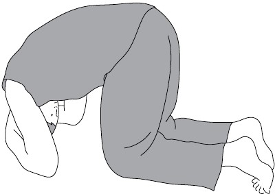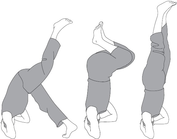 Встаньте в нескольких сантиметрах от стены, поставьте ладони на пол, пальцы направлены к стене. Вслед за махом одной ногой сразу сделайте мах другой. Таким образом, ваши ноги поднимутся вверх и обопрутся на стену. Вам нужно удерживать баланс на руках. Стойку на руках можно делать тем, у кого нормальное артериальное давление. Людям с повышенным давлением ее делать не стоит, поскольку много крови притекает к голове, сосуды наполняются ею, и это чревато нежелательными последствиями. Поначалу рекомендуем стоять на руках не очень долго, порядка 6–12 циклов дыхания. После этого нужно плавно опустить одну ногу, затем вторую и встать на колени, касаясь лбом пола. Эта поза напоминает молитвенную позицию у мусульман. В ней рекомендуется находиться несколько секунд, пока кровь снова не перераспределится по телу. После этого можно выпрямляться.