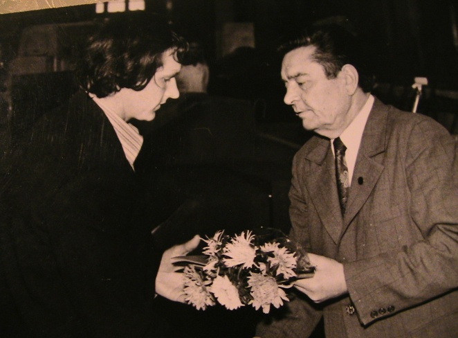 Директор завода Герой Социалистического Труда П.А.Григорьев награждает активного рационализатора электромонтера литейного цеха В.В.Яшина