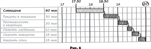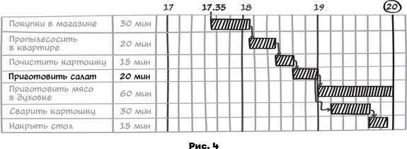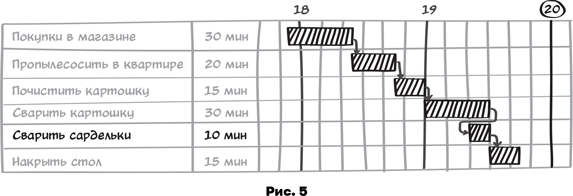 В этом случае вы можете решить, что вместо возни с картошкой можно ограничиться макаронами, да и сардельки готовить намного быстрее, чем мясо. Предположим, что у меня всего одна кастрюля, поэтому эти задачи выполняются последовательно. Теперь расписание проекта выглядит так, что вы успеваете встретить гостей в убранной квартире с накрытым столом (рис. 6).