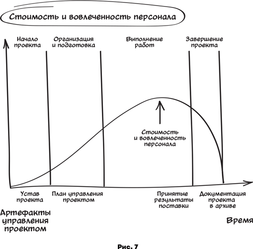 В начале проекта на этапе инициации в работу вовлечено немного людей: спонсоры и менеджер проекта. На этапе планирования добавляется архитектор и начинает собираться команда. Во время выполнения работ количество вовлеченных людей достигает своего пика. А когда работы выполнены и нужно сдавать результаты проекта, количество вовлеченных людей сокращается.