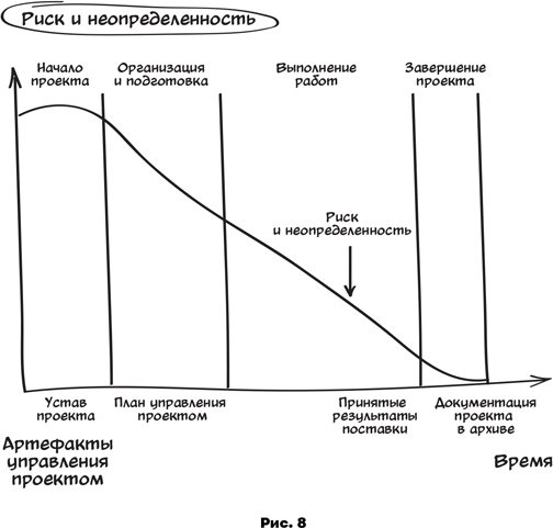 По мере планирования и дальнейшей работы над проектом количество рисков снижается. Команда получает больше информации, и уровень неопределенности падает. Уже к середине проекта количество рисков уменьшается вдвое, а в конце их почти не остается (рис. 8).