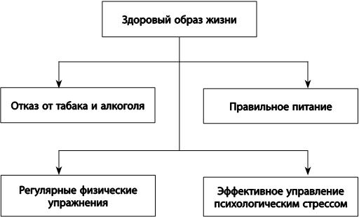 Широкомасштабные медицинские исследования доказывают, что если люди начнут вести здоровый образ жизни в первой ее половине, средний возраст может увеличиться до 86 лет. Все, что нужно для этого, – отказаться от табака и чрезмерного потребления алкоголя (особенно крепкого), следовать советам по функциональному питанию, иметь регулярную (не менее часа ежедневно) физическую нагрузку и предотвращать психологические стрессы (рис. 10). Кроме того, необходимо периодически «тренировать» защитные системы организма и соблюдать режим сна и отдыха. Даже если вам уже за сорок, немедленный отказ от вредных привычек, правильное питание и физическая нагрузка помогут взять под контроль развитие главной причины возрастной смертности – ишемической болезни сердца. Звучит довольно знакомо, но что конкретно происходит, когда человек придерживается здорового образа жизни и чем можно помочь своему здоровому долголетию? Рассмотрим подробнее.