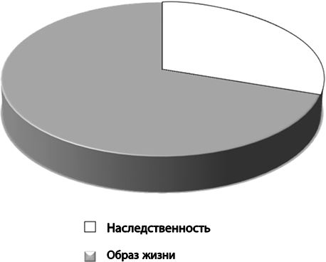 Для того чтобы выяснить, насколько велика роль наследственности в обеспечении долголетия человека, обычно изучают продолжительность жизни генетически идентичных близнецов. Как показали эти исследования, вероятность прожить более 80 лет, имея среднестатистический геном, составляет 20–30 % (рис. 11). Остальной вклад в долгожительство вносят образ жизни и случайные факторы.