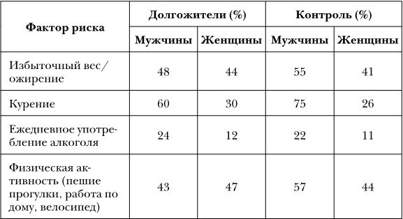 Если рассматривать супердолгожителей, способных прожить более 100 лет, то окажется, что они имеют существенно большую, чем остальные люди, наследственную компоненту – 33 % у женщин и 48 % у мужчин. Меньший вклад в их долгожительство факторов среды подтвердило и американское исследование супердолгожителей среди евреев ашкенази, показавшее, что долгожители достоверно не отличаются от контрольной группы по образу жизни, имея такую же подверженность основным факторам риска, среди которых повышенный индекс массы тела, употребление алкоголя или курение (табл. 5). Поскольку, как отмечалось выше, для среднестатистического генотипа факторы риска играют определяющую (75 %) роль, отсутствие различий в образе жизни обычных людей и супердолгожителей свидетельствует о гораздо большем вкладе генотипа последних.