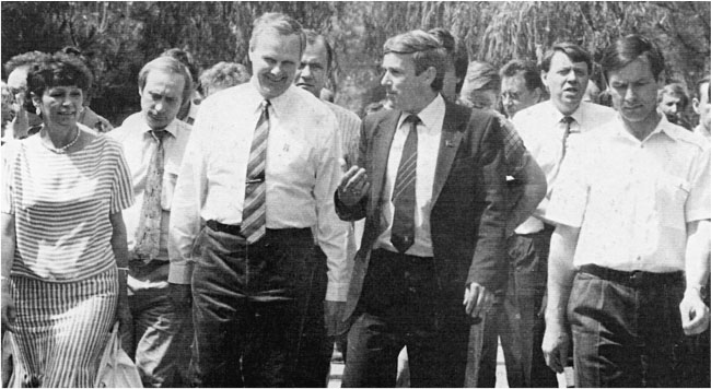 Визит «учителя Путина» Анатолия Собчака в Новочеркасск. Слева направо: Татьяна Бочарова, Владимир Путин, Анатолий Собчак, Сергей Шаповалов, Владимир Колесников, Николай Присяжнюк (фото из книги Т. Бочаровой «Кровавый полдень» о «черном» дне г. Новочеркасска 2 июня 1962 г.). Историческое фото датировано 9 июня 1991 года