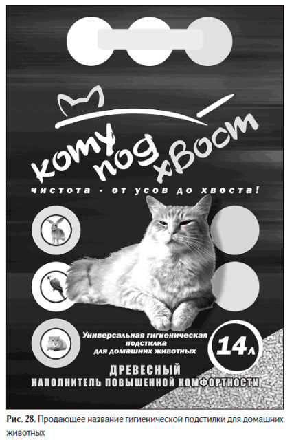 Следующий пример. Живёт ли у вас в квартире какое-нибудь домашнее животное? Ну, например, кошка? Вы, кстати, знаете, что по статистике кошек заводят в два раза чаще, чем собак. Не говоря уже о других, более экзотических братьях наших меньших. Купили бы вы своему питомцу древесный наполнитель «Коту под хвост» (рис. 28), если бы он встретился вам в магазине? Почти уверен, что да. Опять же из любопытства. Конечно, вы не станете его покупать во второй раз, если сам наполнитель вам не понравится. Проблему ненадлежащего качества товара НИКАКАЯ реклама решить не сможет. Но мы сейчас говорим не об этом. К первой пробной покупке такое название наполнителя вас приведет и свою задачу тем самым выполнит.