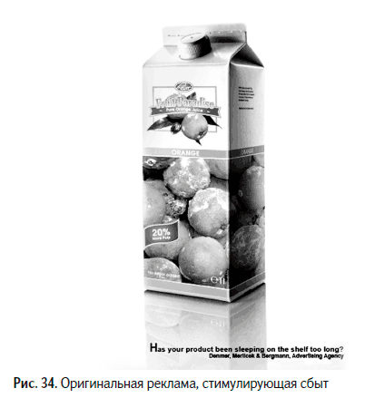 Заголовок объявления можно перевести так: «Ваш товар слишком долго спал на полке супермаркета?». Взгляните, что произошло с апельсинами, изображенными на упаковке (рис. 34).