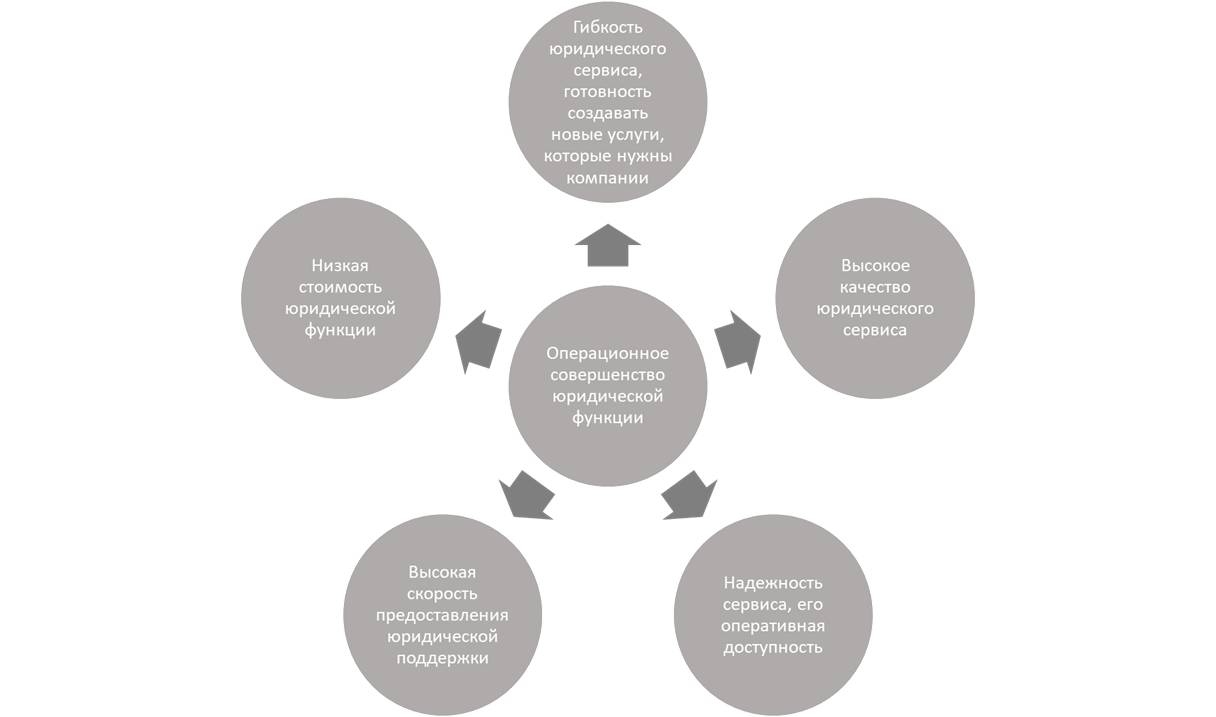 Как мы говорили выше, управляя юридической функцией, руководитель службы создает операционную систему. И это главная задача лидера юридического департамента, которую кроме него никто в компании выполнить не может. Но в чем именно заключается выполнение этой задачи? Если применить аналогию из общей теории менеджмента, то создавая операционную систему юридической функции, ее лидер стремится достичь ее операционного совершенства (operations excellence), которое можно представить в виде следующей схемы: