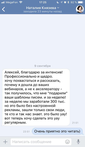 Шаблоны писем, которые я использую в своей работе, вы можете скачать совершенно бесплатно по этой ссылке: https://web.alekseyaleksandrov.ru/1. На скриншоте переписки вы видите, как девушка-предприниматель делится своими финансовыми результатами: их она получила, применив шаблоны в своем проекте. Так что скачивайте письма, внедряйте их у себя и получайте дополнительную монетизацию.