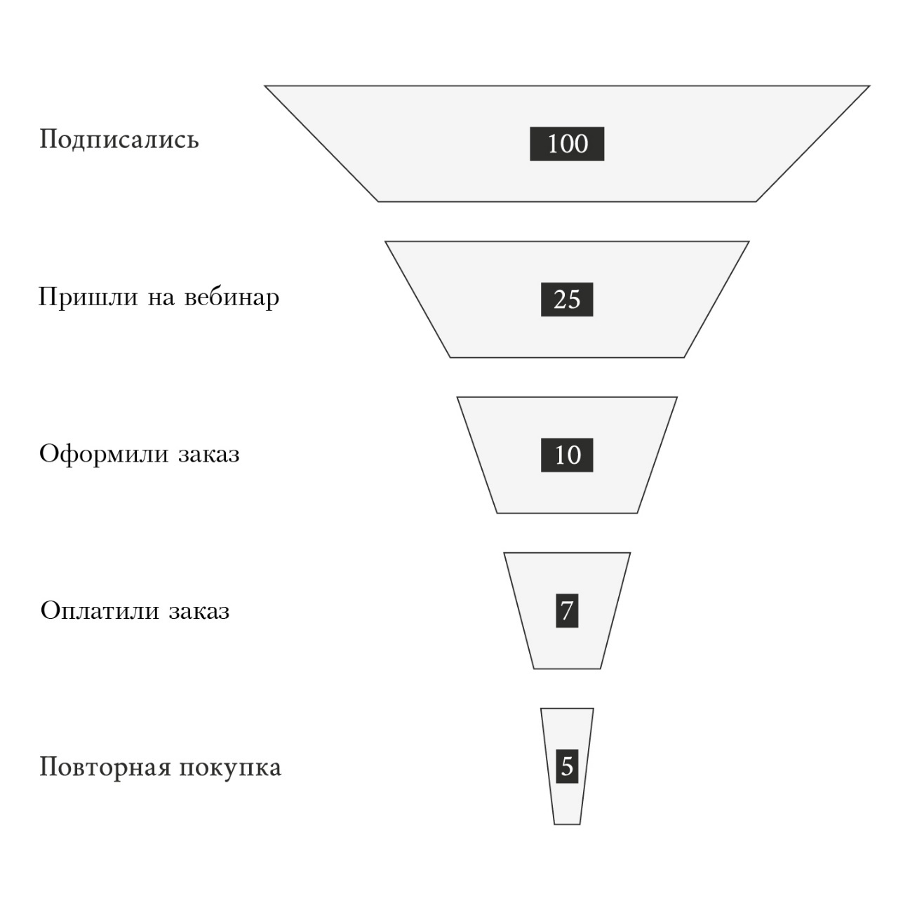 Почему последовательность действий называется воронкой продаж? Вспомните схему: этот процесс выглядит как перевернутый вершиной вниз треугольник. В широкую верхнюю часть попадают все входящие обращения, а до самого низа (то есть реальной покупки) доходит значительно меньше участников. Постепенное сужение от верхней части к нижней действительно выглядит как воронка.