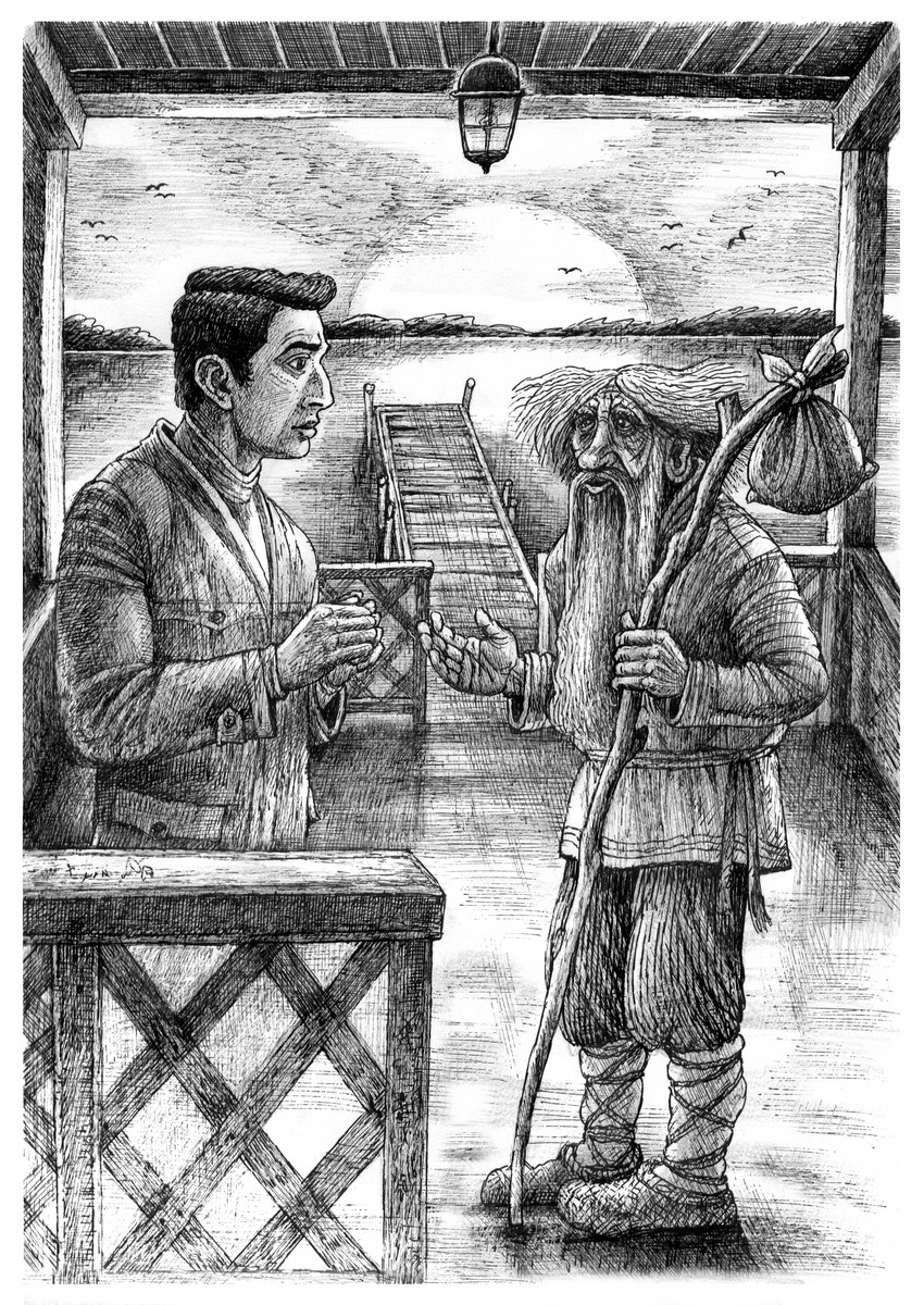 Солнце садилось, осенний ветерок обдувал его в беседке у причала, когда к нему вдруг откуда не возьмись подошел незнакомый старик. Выглядел он немного странновато. С распушенными седыми волосами и бородой, одетый в старомодные холщовые штаны и куртку, подпоясанную веревкой, он был явно не из мира сего. На ногах его были и вовсе одеты лапти, а в руках он держал палку с привязанным узелком, как будто вышел прямиком из Екатерининских времен царской России.
