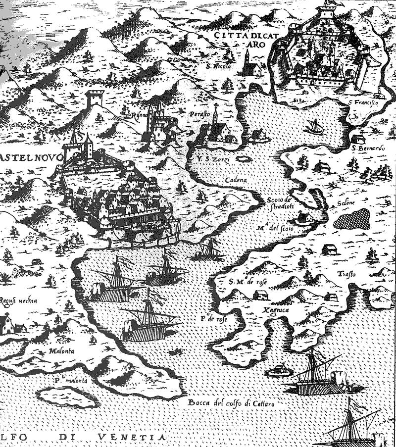 Старинная карта Которского залива, с многочисленными галерами в виду мелководья залива, да и всего Средиземного моря в то время.