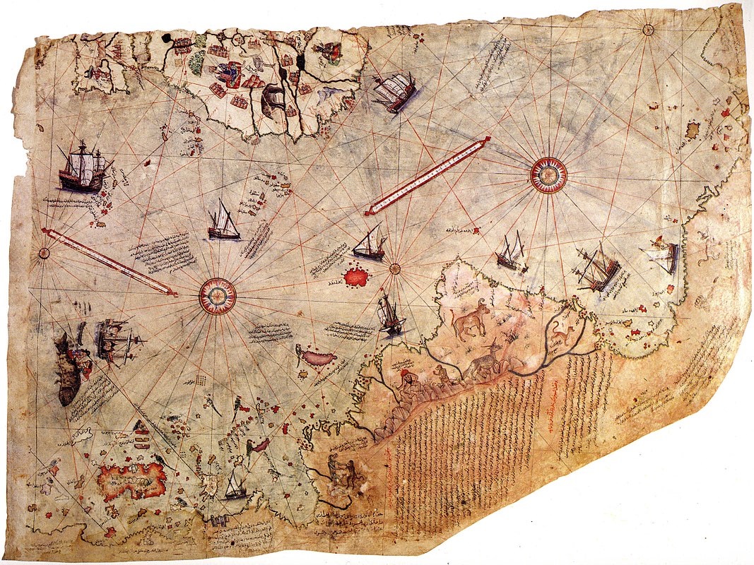 Уцелевший фрагмент первой мировой карты Пири-реиса датируемый 1513 годом.