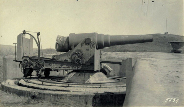 240-мм орудие в барбетной установке броненосца «Вобан». Крестообразная амбразура позволяла точно наводить ствол орудия без необходимости вращать колпак.