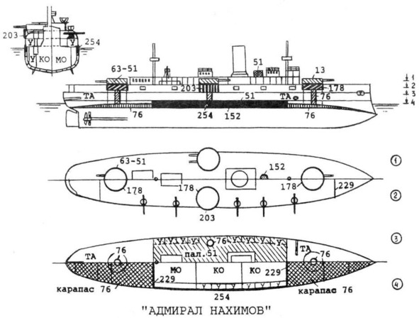 Схема бронирования броненосного корабля «Адмирал Нахимов»