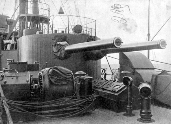 Башня под 6-дюймовые орудия крейсера «Олег». В данной альтернативе, башни под 4,7-дюймовые орудия были чуть меньшего размера, примерно, на четверть