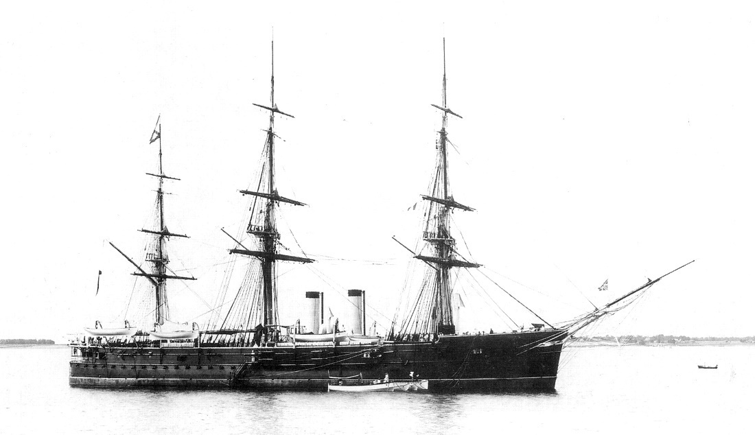 Полуброненосный фрегат «Генерал-Адмирал» (4600 тонн, 87,4х14,6х6,45 метра. Броня борта до 6-дм, палуба ½-дм, 1ПМ, 4700 л/с, 13,2 узла, 3900 миль, 472 человека, четыре 8-дм/22-кал, два 6-дм/23-кал)