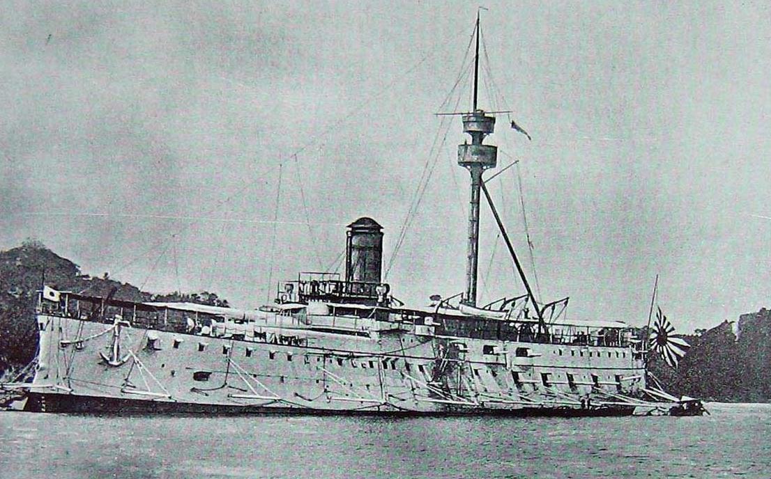 Бронепалубный крейсер «Ицукусима» в период японо-китайской войны. (4278 тонн, 91,81х15,6х6 метров, броня палубы 2-дм, барбет 12-дм, щиты орудий 4-дм, 2ПМ и 6 котлов, 5550 л/с, 16 узлов, 6000 миль, 355 человек, одно 32-см и одиннадцать 4,7-дм орудий)