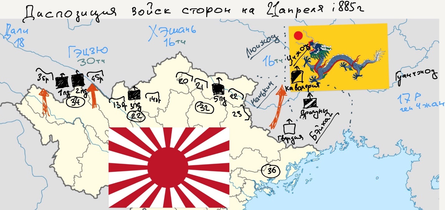 Главнокомандующий армией Ямагата Аритомо наступал совместно с левым флангом армии. Его штаб находился при частях 3-й пехотной дивизии, усиленной единственной в японской императорской армии артиллерийской бригадой, состоявшей из орудий производства фирмы Крупп. Аритомо видел своих солдат, растянувшихся на горных дорогах, ведущих в Цинский город Гэцзю, славившийся своим горным делом, и между всего прочего, по информации от купцов, там был расположен склад, на котором собиралось с окрестных уездов золото и серебро. Размышлял главнокомандующий: «Сегодня уже 15 апреля. Две недели идет наступление, а успехов достигла 1-я кавалерийская дивизия генерала Козо и 6-я драгунская барона Ямамото, которая первая достигла Бэйхая, славящегося своим идеальным жемчугом и активной прибрежной торговлей. Но, что делать дальше? Вроде бы есть план! Охватывать центральную группировку Цинских войск, состоявшую из 32 зеленых знамен, и которые могли бы быть развернуты в 320 тысячную армию. И он решил действовать по первоначальному плану, приказав отправить посыльных к командиру 1-й кавалерийской дивизии с приказом о дальнейшем наступлении в субтропики Учжоу, находящимся севернее их настоящего расположения».