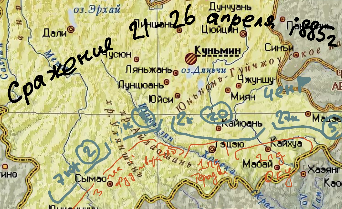Генерал Тэраути стал подсчитывать потери своих войск. Они составили всего 280 человек. У соседней 2-й дивизии они тоже были небольшими, всего 320 человек, ну а у дикарей из 3-й и 4-й пехотных туземных бригад генерал-майора Фудзивары все 410. Но непонятно, сколько уничтожил противник, а сколько съели свои, чтобы не лечить и не доставлять в госпиталя. Подошла наконец то и 3-я пехотная дивизия генерала Куроки. Главнокомандующие обнялись, много рассказывали друг другу о происходящем, и отправили телеграмму маркизу Ито в Хайфон, с донесением о произошедшем. Он в ответной телеграмме поблагодарил за службу, приказал выдвигаться трем дивизиям регулярной армии выдвигаться севернее на город Куньмин, до которого было порядка двухсот километров, но предупреждал, о том, что с севера может подойти семидесятитысячная армия противника, и надо быть на чеку, но не отступаться от своих планов, утвержденных в штабе. И три японских военачальника наметили маршруты движения своих войск.