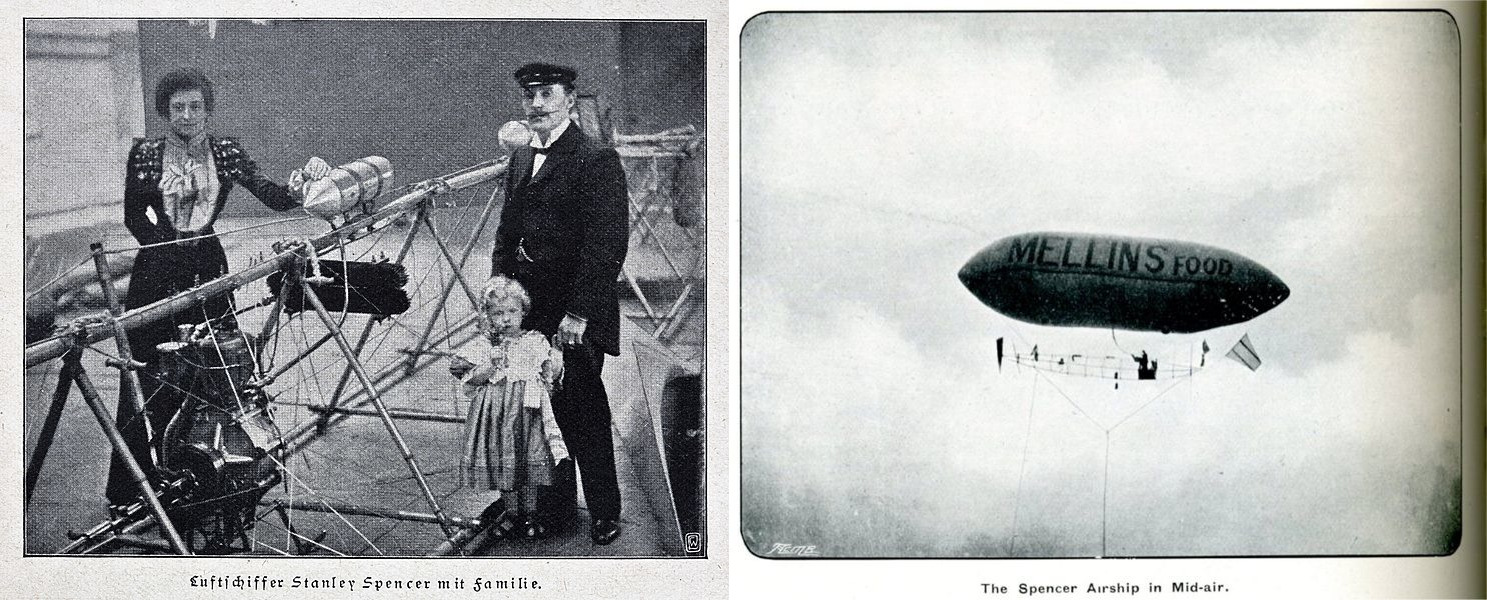 Но раз затронули английский «Morning Post» то предлагаю ознакомиться чем знаменит в сфере дирижаблей туманный Альбион. Но раз «Утренняя почта» была закуплена на другом берегу Ла-Манша, то сразу образуется скептицизм. Но британцы подошли к делу с присущим им практицизмом. Первый дирижабль, спроектированный и построенный на острове, был построен Стэнли Спенсером, и 22 сентября 1890/1902 года он совершил перелет в трех десятках милях или примерно пятидесяти километрах от Кристал Пэлас83, где и был собран, в Лондоне до Руислип с рекламой детского питания. Объем оболочки составлял 570 м3, гондола выполнена из бамбука. В общем копия аппарата Гастона Тиссандье 1883 года, и в данном случае отставание видно всего семь лет, что более приемлемо.