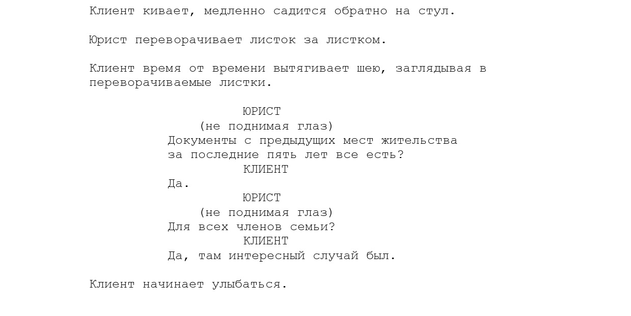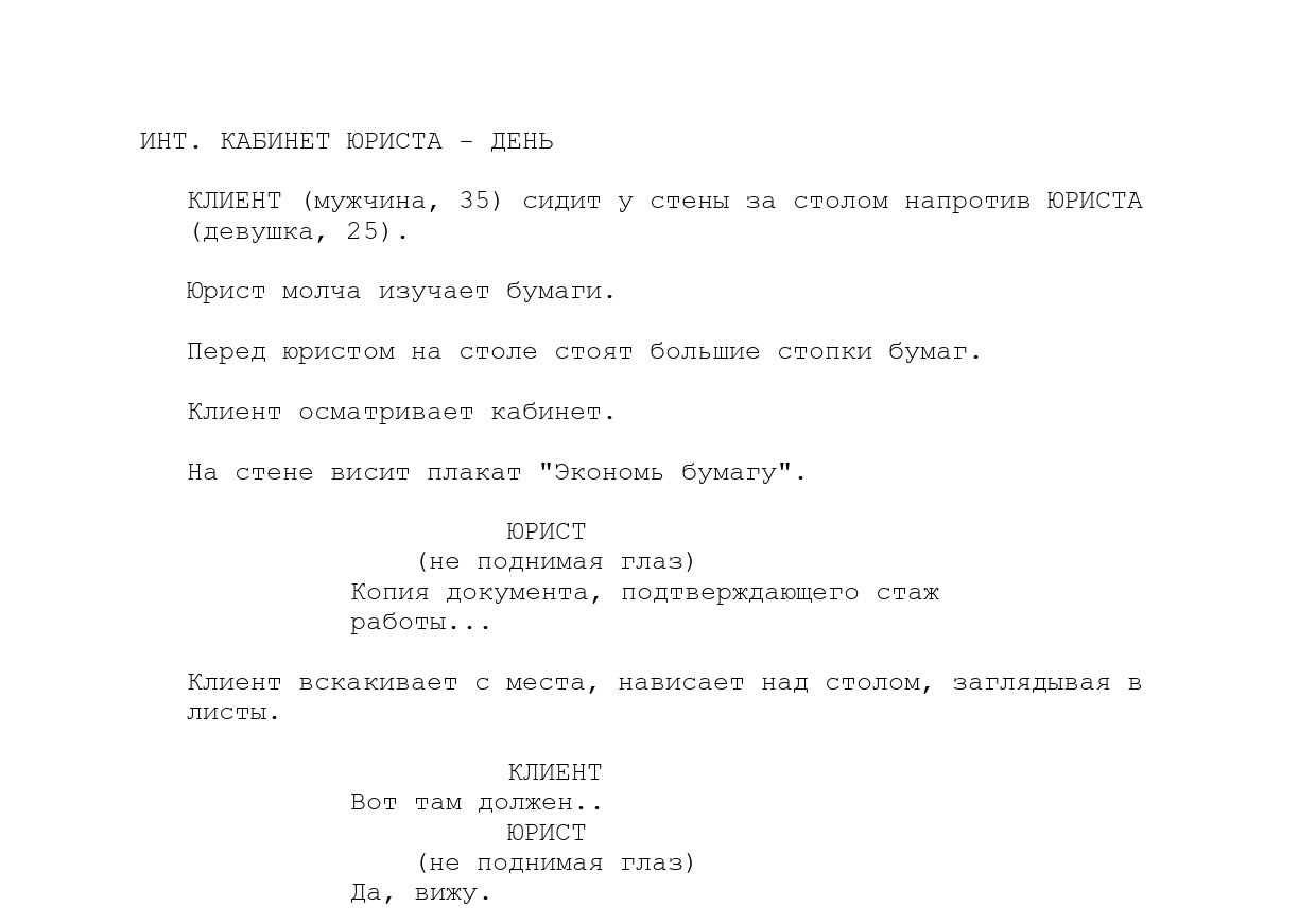 Поэтому на данном этапе я советую ваш сценарий переписать, отформатировать в формат американской записи. Что нужно помнить? В начале каждой сцены указывается локация и время суток (день или ночь), описание действия записывается с новой строки. Имена или характерные названия персонажей (Пекарь, Прохожий, Мальчик и пр.) записываются всегда с большой буквы. Запись имени персонажа при первом появлении в сценарии производится всеми прописными буквами (МАКАР, ДИРЕКТОР, ВАРЯ и др.). Диалог записывается следующим образом. По центру страницы прописными буквами записывается имя персонажа, произносящего речь, если требуется указать, каким образом произносится та или иная фраза, ремарка записывается в скобках под именем малыми прописными буквами. Далее записывается текст прямой речи. Более подробную информацию о формате абзацев можно посмотреть на сайте http://www.screenwriter.ru/info/format.
