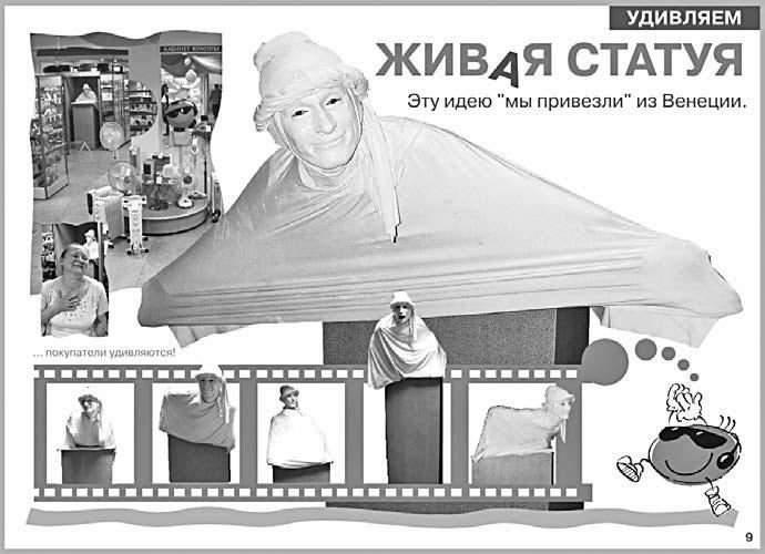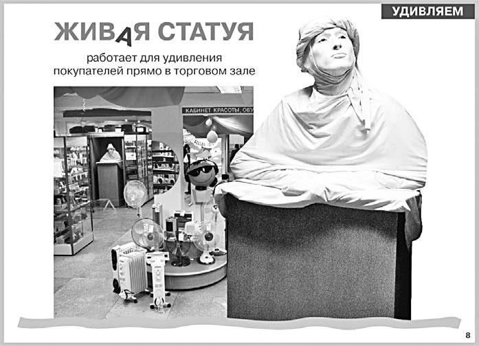 Затем, от греха подальше, мы поставили своего человека на входе. Он здоровался с покупателями: «Здравствуйте, проходите пожалуйста! Не пугайтесь, у нас в зале живая статуя стоит» и показывал рукой в направлении ребят.