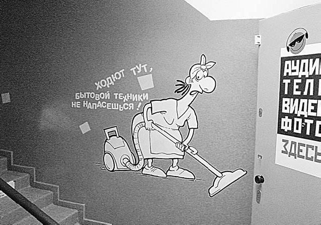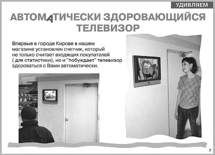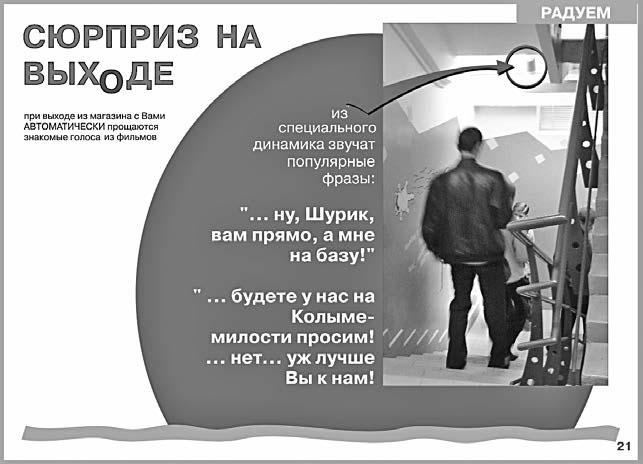 Кроме живой статуи у нас было еще немало смешных фишек. Мы поставили электронный счетчик входящих и выходящих людей. И когда человек заходил в магазин, встроенный в стену плоский телевизор оживал и здоровался с покупателем смешными подходящими отрывками из известных советских мультфильмов – про попугая Кешу, «Малыш и Карлсон» и других. А когда посетитель выходил, то на лестничной площадке (а мы были на втором этаже) из динамика в случайном порядке раздавались шуточные прощания из разных советских комедий: «Ну, будете у нас на Колыме, милости просим! Нет уж, лучше вы к нам!»
