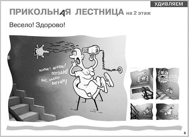 Стены на лестнице были разукрашены смешными рисунками. Когда человек поднимался по лестнице, он уже начинал улыбаться.