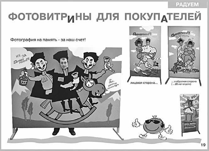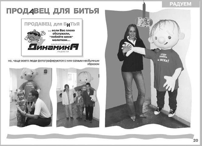 А на выходе у нас висел кукольный «продавец для битья» – почти в полный рост, в джинсах и кедах. Рядом с ним висел надувной молоток – по примеру Японии, где люди бьют чучело начальника. Этого продавца нам в местном театре кукол изготовили. Мы предлагали покупателям, если их плохо обслужили, побить кукольного продавца надувным молотком. Но его никто почему-то не бил, все с ним фотографировались на память.
