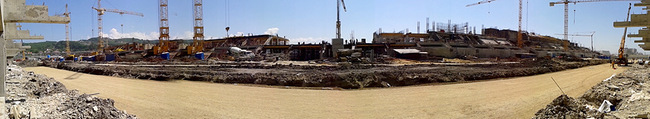 Сам объект «стадион» был в раз 10 больше коттеджей и был огражден высоким забором, вдоль которого стояли видеокамеры для отслеживания нарушителей. На подходе к стадиону стоял временный бетонный завод с него, собственно говоря, и возили раствор в разные части стройки, в том числе и нам, когда работали на другом объекте. Сама площадка находилась в низине, поэтому приходилось спускаться вниз метров 20 по пологому склону, в конце которого находился цех, где сгибали арматуру, почти тут же было рабочее место сварщиков.