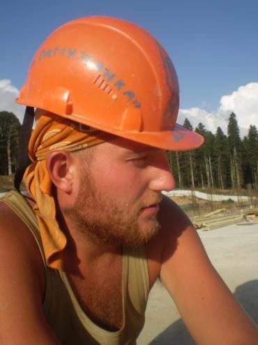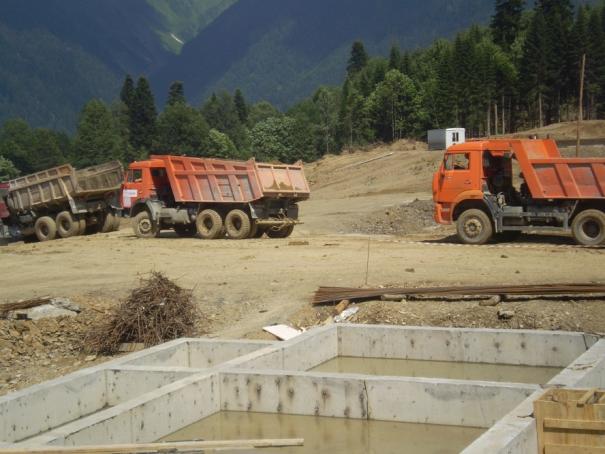 В 13.00 мы, наконец, примерили робу и каски и были готовы к работе, каждая из бригад направилась к своему объекту, до коттеджей шла автомобильная дорога, вдоль которой мы и двинулись. Мимо нас постоянно проезжали полные грунта грузовики, оставляя за собой здоровенные облака пыли, а так как поток был постоянный, мы почти всю дорогу шли, закрывая лицо руками и кашляя. Благо до места работа было метров 500, и уже минут через десять были на месте. Наша стройка представляла собой 2 фундамента для будущих коттеджей олимпийцев, вокруг стройки особо не за что было зацепиться, вдали виднелись горы, а где-то ниже нас за уступом шумела, судя по звуку, тяжелая строительная техника. На нашей же стройке крутились рабочие, я подошел и спросил, где бригадир, мне указали на тент натянутый прямо возле фундамента.