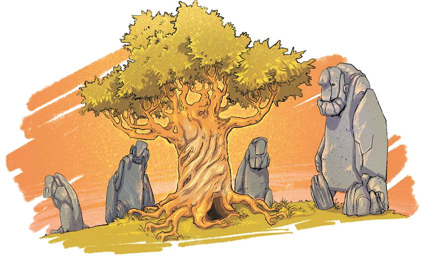 Она рывком села… и быстро-быстро отползла спиной назад обратно к норе. На поляне вокруг сияющего дерева бродили каменные громады. Мощные тела, составленные из замшелых гранитных скал, сбитые из камней руки и ноги, головы – криво посаженные валуны с шапками сухой травы и глаза – пылающие провалы, в которых трепетал, будто в клетке, живой солнечный свет.