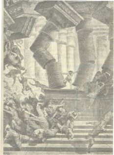 Заключенный в темницу, Самсон горько раскаялся во всех своих многочисленных вольных и невольных прегрешениях, разгуле, грабежах и непристойных похождениях, и, видно, небо, в конце концов, смилостивилось над ним. Волосы стали быстро отрастать, а вместе с ними начала возвращаться и сила. Самсон старался всячески скрыть свою возрастающую мощь: он притворялся слабым и даже немощным, еле, словно из последних сил вертел жернов своей мельницы и даже не откликался на насмешки, лишь иногда как бы угасающим голосом прося пощады. Филистимляне совсем привыкли к мысли, что их плененный и слепой Самсон беззащитен и хил. И вот однажды, когда в городе Газе происходило шумное и красочное, с кровавыми жертвоприношениями, празднество в честь их идола Дагона, знать филистимлянская пожелала, чтобы в храм был приведен Самсон. Им хотелось унизить Самсона, заставив его, израильтянина, поклонявшегося богу Яхве, войти в языческое капище, чтобы таким образом участвовать в церемонии, посвященной языческому идолу. Самсон, скрывая вернувшуюся к нему силу, послушно вошел в храм и так же послушно попросил подвести его к колоннам. Он хотел показать, что не может стоять на ногах без опоры и поддержки. Прислужники подвели его к колоннам, и он тотчас ухватился руками за две из них. Затем случилось страшное: Самсон с такой силой потряс каменные столпы, служившие опорой всему храму, что они рухнули вместе с тяжелым сводом и стенами.