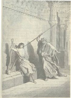 Услышав музыку, Саул, сидевший с понурой головой, успокоился, выпрямился, но, взглянув на музыканта и узнав Давида, пришел в неописуемую ярость, схватил копье и метнул его в юношу. К счастью, он промахнулся.