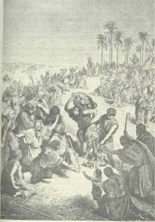 И вот снова после многих странствий по городам Галилеи пришел Христос на любимые им берега Тивериадского озера. Ему хотелось остаться одному, чтобы предаться размышлениям и обновить духовные силы. Но слава его была уже так велика, что всюду, где он ни появлялся, к нему стекался народ. На этот раз, ища уединения, Иисус вместе с учениками не остался на берегу вблизи рыбацких хижин, а поднялся на одну из тех пологих и очень красивых гор, что опоясывают озеро подобно драгоценной оправе. С горы открывался чудесный вид и на водную гладь неподвижного озера, и на огромное пространство, уходившее далеко за горы. Воздух был прозрачен и чист, четко виднелись сады, рыбачьи лодки, возделанные поля, среди которых, разделяя их, шла старая караванная дорога. Вскоре Христос заметил большие толпы людей, двигавшихся по дороге с северной стороны. Было видно, как к ним присоединялись и жители окрестных деревень. Ученики сказали Иисусу, что народу не меньше пяти тысяч и что они, конечно же, идут к Иисусу, так как прослышали о его появлении.