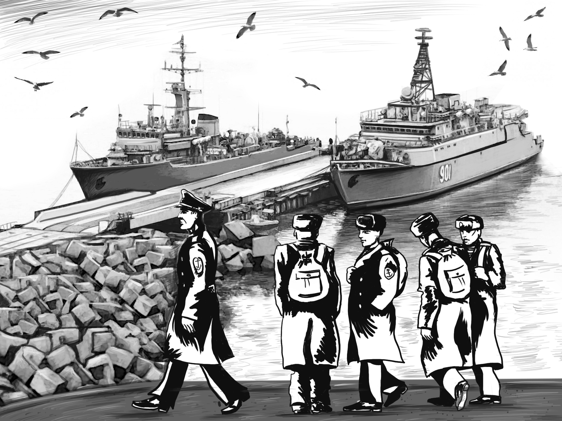 Во второй половине дня в казарму вошли двое: высокий молодой офицер, старший лейтенант и старший матрос, позже мы его будем называть Еремой. Я, Вася, Новожил и Горох оделись по форме, забрали вещмешки и направились долой из этой части. Через полчаса, выйдя из автобуса на остановке, я увидел высокое белое здание – это был штаб НВМБ (Новороссийской военно-морской базы). Поодаль от него расположились стенки (причалы), направленные в сторону моря, вдоль которых были пришвартованы военные корабли. Я никогда не был на корабле, а на военном тем более.