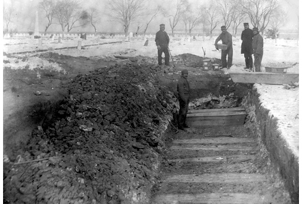 Фотография 1886 г. – захоронение тел малоимущих во рву. В Филадельфии тех лет трупы малоимущих, больных особо опасными инфекциями, казненных государственных преступников, а также неопознанные тела хоронили не в отдельных могилах, а в общем рве, буквально один над другим. Делалось это вне территории кладбищ. До сих пор на территории города находят неучтенные захоронения XVIII – XIX веков и всякий раз такое событие становится головной болью для городских властей, ведь в могилах могут находиться тела умерших от чумы, оспы, туберкулёза и иных особо опасных болезней! Примечательно то, что трупы казненных уголовных преступников зачастую возвращались родственникам и предавались земле на обычных кладбищах.