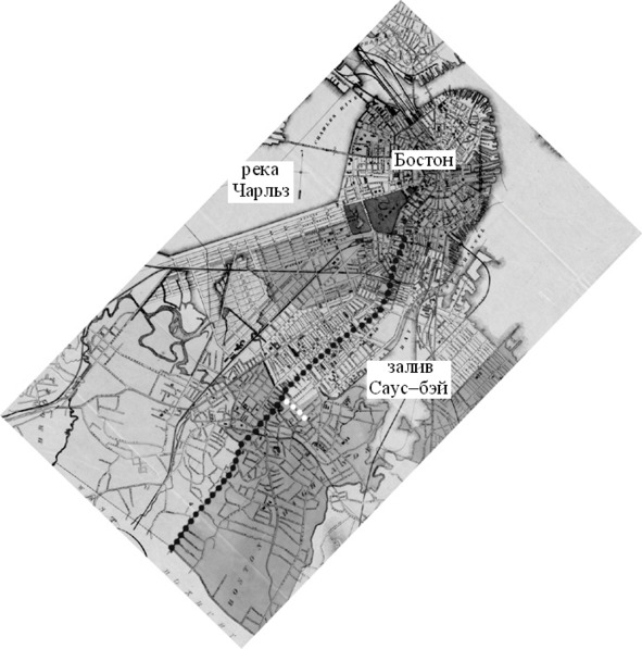 Это карта Бостона и пригородов относится к 1852 году, то есть составлена она за 20 лет до описываемых событий. Здесь ещё нет газового завода в Кембридже, да и сам этот городок выглядит совсем маленьким. Чёрным пунктиром показана Вашингтон-стрит, тянувшаяся от южной границы Бостона к самому центру города и имевшая тогда длину чуть более 3,3 км. К 1872 г. южная граница Бостона отодвинулась гораздо ниже обреза карты, в результате чего длина Вашингтон-стрит превысила 5,5 км. Эта улица стала самой длинной в Бостоне, своего рода нервом города, вокруг которого закручивалась деловая активность его жителей.