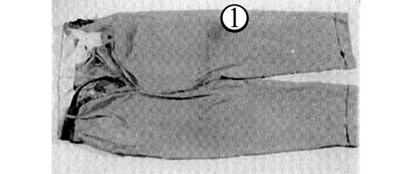 Брюки Сэма Шэппарда с небольшим замытым пятном крови (обозначено цифрой «1»). Именно будучи в этих брюках, он, по его словам, боролся с неизвестным убийцей. Футболку Шэппарда найти не удалось; по мнению полицейских, крови на футболке должно было быть намного больше.