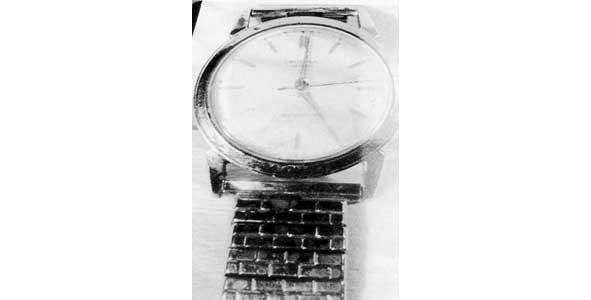 Часы Сэма Шэппарда с небольшой каплей крови, найденные в зелёном мешочке в кустах позади дома. Детективы справедливо предположили, что преступник, убивший Мэрилин Шэппард и успешно отбившийся от её мужа, не имел никаких оснований выбрасывать эти часы.