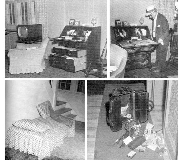 Слева вверху: письменный стол-бюро с выдвинутыми ящиками, находившийся в гостиной комнате 1-го этажа; между ним и стеной была найдена жестяная коробочка с окровавленными часами Мэрилин Шэппард, остановившимися в 3:15. Вверху справа: коронер Сэм Гербер осматривает письменный стол; коронер чрезвычайно любил фотографироваться в местах совершения преступлений, демонстрируя свою компетентность и деловитость. Внизу слева: тахта перед телевизором в гостиной 1-го этажа, на которой уснул Сэм Шэппард. Внизу справа: докторский саквояж Сэма Шэппарда с вывалившимися из него инструментами и лекарствами; согласно утверждению доктора, из саквояжа пропали ампулы морфия и демерола (8 штук).