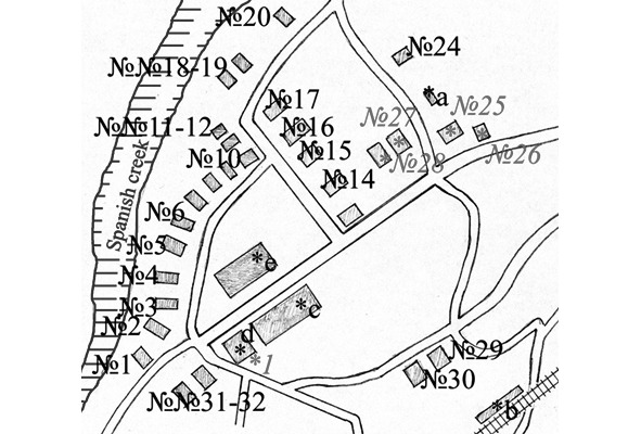 План курортной зоны «Кедди резёт». Условные обозначения: «а» – гараж; «b» – железнодорожная платформа; «c» – гостиница; «d» – магазин; «e» – здание бара и ресторана. Цифрами показаны номера жилых домиков. На момент описываемых событий дом №10 был разрушен, и на его фундаменте возводилось новое строение, а постройка домов №29 и №30 была только закончена, и они ещё ни разу не заселялись. Светло-серым цветом выделены дома: №28, занятый семьёй Шарп; №27, где проживали их ближайшие соседи, семья Сиболт; №25, в котором разместилась семья Дуга Альбина и немного далее за ним – №26, сданный в аренду семье Смартт. Все поименованные лица в той или иной степени окажутся вовлечены в трагические события апреля 1981 г. Знаком «*1» обозначено место расположения мусорного контейнера у чёрного выхода из магазина, в котором будут обнаружены окровавленные вещи.