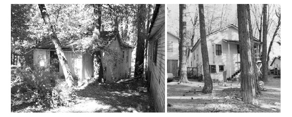 Дом №28. Слева: фотография с южной стороны. Хорошо видно, что расстояние до соседнего дома №27 составляет считанные метры, постройки стоят буквально стена к стене. Справа: северный фасад дома №28. Крыльцо и лестницу частично заслоняет ствол дерева, но общее представление о конструкции дома и окружающей обстановке эта фотография даёт.
