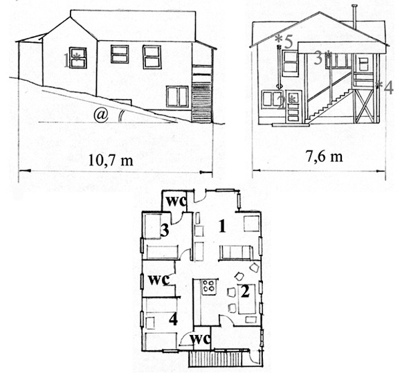 Общий вид дома №28 и схема второго этажа. Дом был построен на склоне холма, полого спускавшегося с юга на север (т.е. лестница с крыльцом находились на северной стороне дома). Условные обозначения на эскизе общего вида: @ – величина уклона холма, равная 11°; «*1» – окно «мальчишеской» спальни, где обычно ночевали младшие из братьев Шарп – Рик и Грег; «*2» – дверь на первом этаже северного фасада, через которую можно было попасть в две комнаты, занимаемые Джоном Шарпом, старшим из братьев; «*3» – лампочка на северном крыльце, обычно включавшаяся в тёмное время суток; «*4» – розетка, в которую необходимо было вставить вилку электропитания для того, чтобы включить лампочку «*3»; «*5» – отверстие в северной стене дома, через которое вводился телефонный кабель. Условные обозначения на схеме второго этажа: «1» – гостиная комната, в которую можно было попасть через входную дверь на южной стороне дома; «2» – кухня с набором встроенной мебели, электрической плитой, большим обеденным столом, набором стульев и небольшим диваном на двух человек («лавситом»); «3» – «мальчишеская» спальня для младших братьев Шарп; «4» – «женская» спальня, которую занимали Гленна Шарп и обе её дочери, Шейла и Тина; «wc» – уборные.