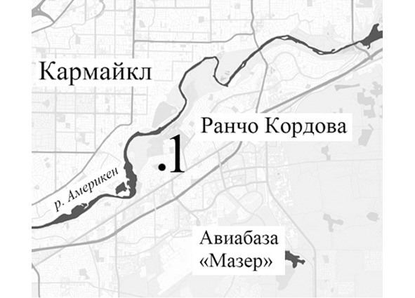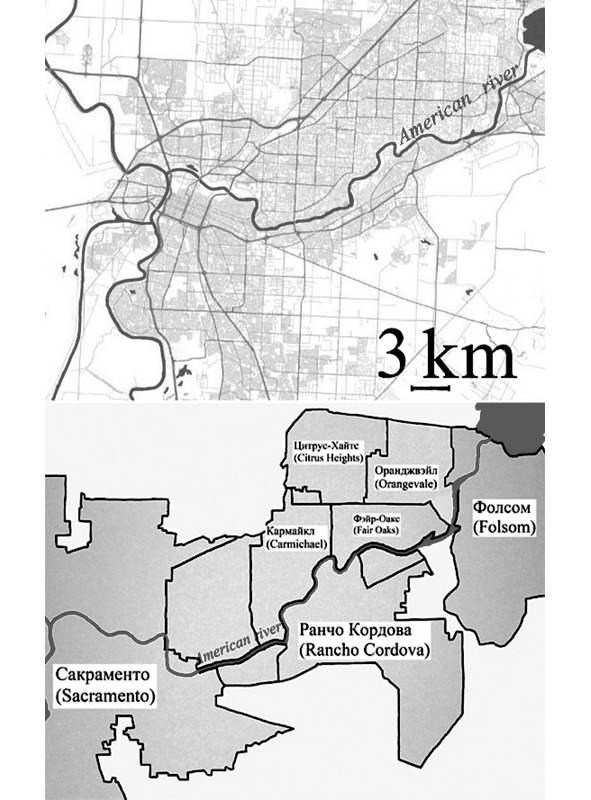 Карта вверху демонстрирует плотность застройки как самого города Сакраменто, так и его восточных пригородов. Схема внизу показывает административное деление той же самой территории. Фактически вся область по обеим берегам реки Америкен (American river) уже к началу 1970-х гг. на протяжении примерно 35 км. представляла собой сплошную городскую застройку, преимущественно малоэтажную. Административное деление этих территорий весьма условно, как таковых городских окраин внутри агломерации Сакраменто нет, зачастую один угол перекрёстка входит в границу одного города, а другой находится уже в другом. Многие улицы тянутся на десятки километров через несколько городов. Нижняя схема позволяет составить представление о взаимном расположении тех населенных пунктов, где развернутся основные события настоящей книги.