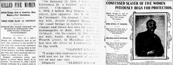 Слева: первое сообщение в газете от 26 февраля 1903 года о сделанном Кнаппом признании в 5-и убийствах. В центре: текст лаконичного признания Альфреда Кнаппа, воспроизведённый в газетной публикации дословно. Справа: одна из первых больших статей об Альфреде Кнаппе в номере от 27 февраля была иронично озаглавлена «Сознавшийся в убийстве пяти женщин жалобно молит о защите».