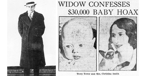 Слева: убийца мафии Хайман Мартин после ареста в марте 1931 года. Справа: фотография из газеты мошенницы Кристин Смит и малыша, взятого ею из приюта для обоснования права на наследование дома и земли отца умершего мужа Кристин.