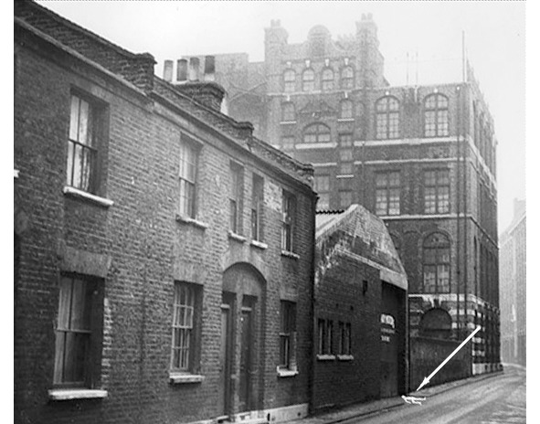 Этот панорамный фотоснимок, относящийся к 1889 году, позволяет получить представление о том месте на улице Бак Роу, где в ночь на 31 августа было найдено тело убитой женщины (на снимке оно схематически изображено белым цветом и на него указывает стрелка). Бак Роу стрит представляла собой своеобразный коридор между стенами домов по обе стороны, все дворы и фасадные двери в ночное время были закрыты, здесь не было палисадников, газонов или парка. Это означало, что убийце после совершения преступления некуда было спрятаться, он должен был пройти улицу из начала в конец… разумеется, в том случае, если он не жил здесь.