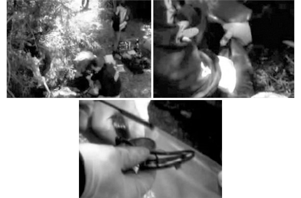 Кадры из видеозаписи, сделанной во время осмотра леса в той части, где были найдены останки. Качество очень плохое, поскольку видеозапись осуществлялась в тёмное время суток. На фотографии в вверху справа: криминалисты открывают найденный черно-синий рюкзак. Внизу: очки, обнаруженные в рюкзаке.